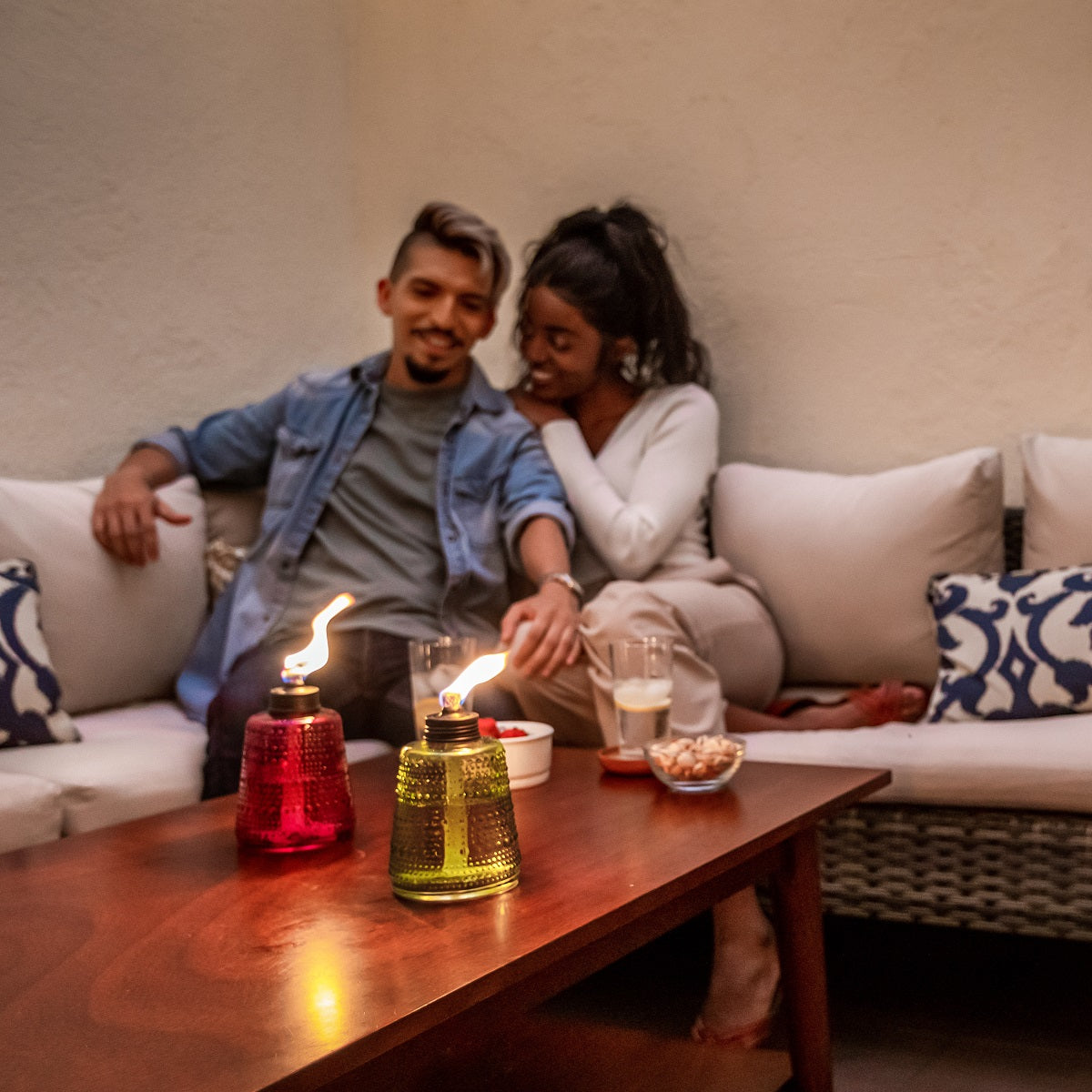 Few things are as enjoyable as dining outside with family and friends. Next time you dine al fresco, gather everyone around your table to experience the warm glow of natural flame lighting with TIKI® Brand Carnival Glass Table Torches. Table Torches make perfect centerpieces to illuminate your table and your conversations. Group more than one together to create a striking focal point or use individually as colorful accents on tables around your yard or patio. Each 16-ounce fill delivers up to 10 hours of burn time when used with TIKI® Brand Torch Fuel. These table torches feature a fun deisgn and are sold as a set including one of each color: green, purple and blue glass. Use with TIKI® Brand BiteFighter® Clean Burn™ Torch Fuel for proven mosquito repellency and dramatically less soot and smoke than traditional petroleum-based torch fuels. TIKI® Brand torch fuel sold separately.